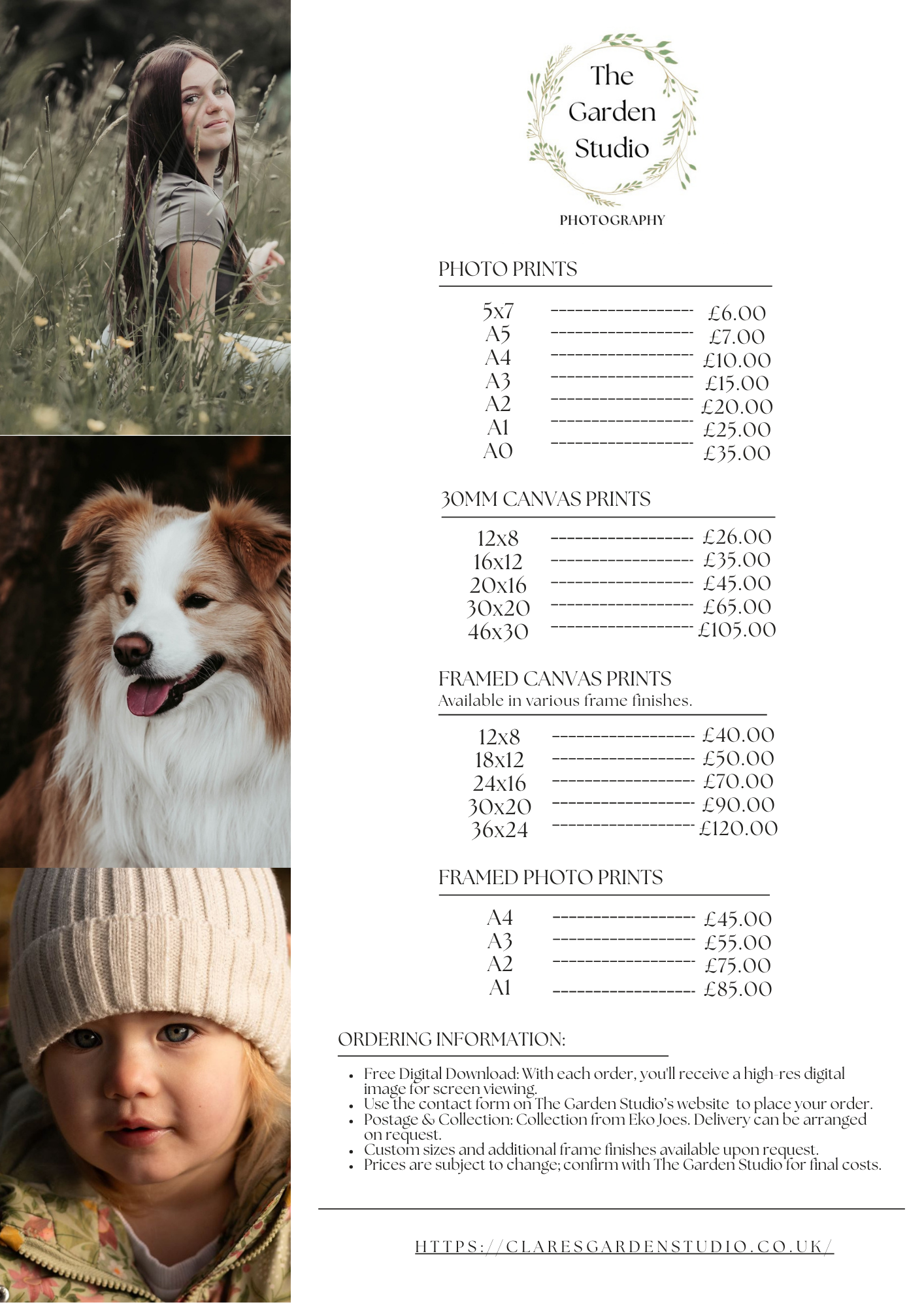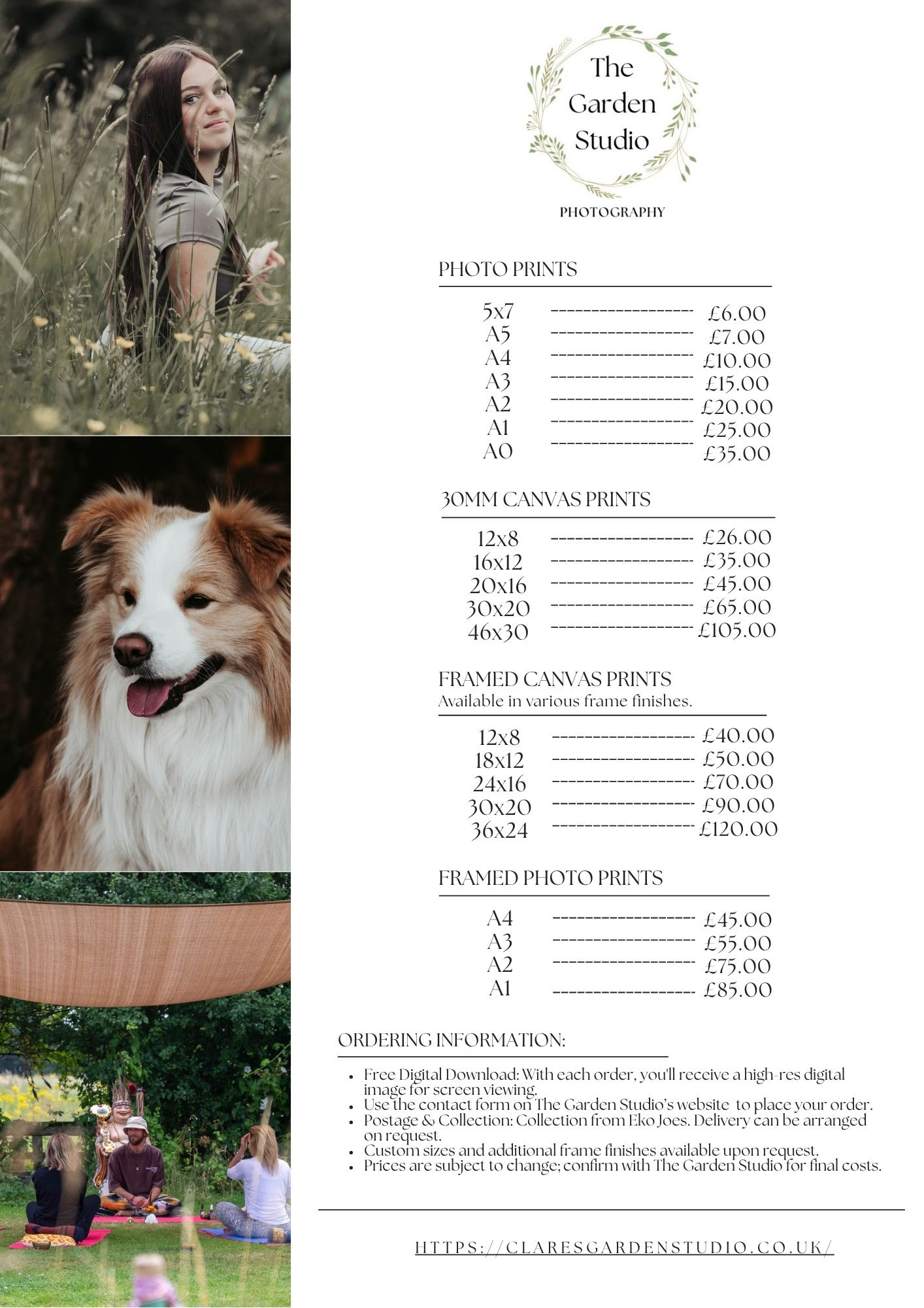 See the price list below. Please use the contact form to order your photos. All prints are produced by Canvas Creatives.